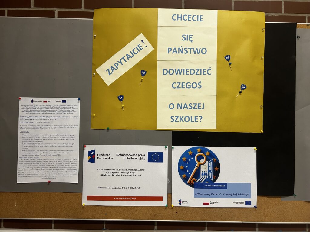Podczas tegorocznych Drzwi Otwartych Szkoły Podstawowej im. gen. Stefana Roweckiego „Grota” w Koziegłowach, które odbyły się 27 lutego rodzice oraz uczniowie mieli okazję nie tylko poznać ofertę edukacyjną placówki, ale również zapoznać się z projektem „Otwieramy Drzwi do Europejskiej Edukacji”, realizowanym w ramach Funduszy Europejskich dla Rozwoju Społecznego (FERS). Na specjalnie przygotowanym stanowisku prezentowano założenia i działania projektu, który otwiera nowe możliwości rozwoju zarówno dla uczniów, jak i nauczycieli. Odbywały się prezentacje multimedialne, pokazy zdjęć z wyjazdów zagranicznych oraz rozmowy z nauczycielami zaangażowanymi w działania projektowe. Uczestnicy dowiedzieli się, jak dzięki wsparciu Unii Europejskiej możliwe jest rozwijanie kompetencji językowych, cyfrowych i międzykulturowych, a także podnoszenie jakości nauczania w szkole. Projekt „Otwieramy Drzwi do Europejskiej Edukacji” umożliwia nauczycielom udział w szkoleniach międzynarodowych, wymianę doświadczeń z partnerami z Europy oraz wprowadzanie innowacyjnych metod nauczania. Uczniowie natomiast korzystają z nowoczesnych narzędzi edukacyjnych, biorą udział w projektach międzynarodowych, wyjazdach i współpracy ze szkołami z innych krajów. To doskonały przykład na to, jak fundusze europejskie realnie wpływają na podniesienie jakości kształcenia i otwierają przed całą społecznością szkolną nowe perspektywy. Drzwi Otwarte pokazały, że edukacja może być nowoczesna, inspirująca i – przede wszystkim – europejska.