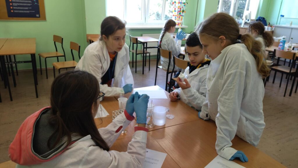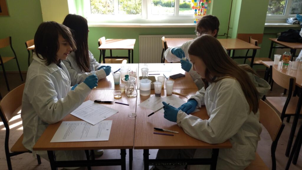 25 kwietnia odbył się w naszej szkole Dzień Przyrodnika. Już po raz drugi gościliśmy uczniów z Szkoła Podstawowa w Czerwonaku, SP Bolechowo i SP Kicin na wspólnym przyrodniczym doświadczaniu i eksperymentowaniu. Hasłem przewodnim tegorocznego projektu była WODA. Podczas zajęć biologicznych z panem Michałem Kaczmarkiem uczniowie mieli okazję zbadać wpływ wody na rozwój grzybów, wytrącali chlorofil z liści oraz prowadzili obserwacje mikroskopowe. Outdoorowe zajęcia matematyczne poprowadziła pani Jolanta Przygocka, która zamieniła się w Głównego Leśnika, po okiem którego ekipy inwentaryzacyjne (uczniowie) rozpoczęły prace miernicze i obliczeniowe, żeby stworzyć metryczkę Stefana, naszej szkolnej starej topoli czarnej. W bloku chemicznym z panią Magdaleną Nowacka młodzi naukowcy badali rozpuszczalność substancji w różnych rozpuszczalnikach, kreowali własne kolumny gęstości oraz „wytwarzali” tlen i wodór. Było twórczo, kolorowo i wybuchowo. Młodzież wykazała się dużą wiedzą, kreatywnością, wyjątkowym zaangażowaniem oraz cenną umiejętnością współpracy.