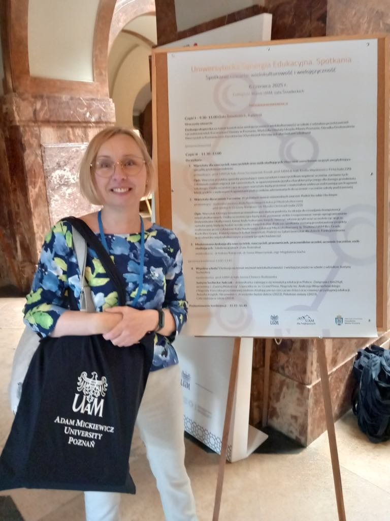 Uczestnicy naszego projektu dokształcają się również na miejscu. Pani Monika Marczyk 7 czerwca wzięła udział w konferencji na UAM w ramach Uniwersyteckiej Synergii Edukacyjnej pt. ”Wielokulturowość i wielojęzyczność”. Konferencja obejmowała prelekcje na temat kontekstów wielojęzyczności i wielokulturowości z udziałem władz oświatowych i przedstawicieli uczelni, praktyczne warsztaty w grupach międzypokoleniowych i dyskusję podsumowującą. Tematyka i poziom merytoryczny spotkania z pewnością wzbogacą już posiadaną wiedzę uczestników.