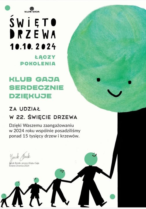 Uczniowie klas 1–3 z zaangażowaniem uczestniczyli w obchodach Dnia Drzewa, biorąc aktywny udział w różnorodnych działaniach edukacyjnych i proekologicznych. Dzieci odwiedziły ośrodki edukacji leśnej, gdzie podczas specjalnie przygotowanych zajęć poznawały rolę drzew w przyrodzie, uczyły się rozpoznawać gatunki drzew oraz dowiedziały się, jak dbać o las. Nie zabrakło też działania – najmłodsi z dumą sadzili młode drzewka w wyznaczonych miejscach, ucząc się odpowiedzialności za środowisko. Dodatkowo uczniowie wykonali piękne prace plastyczne inspirowane tematyką drzew i lasów, które ozdobiły szkolne korytarze. Obchody Dnia Drzewa były doskonałą okazją do kształtowania postaw ekologicznych i rozwijania wrażliwości na piękno przyrody. Za swoje aktywności klasy edukacji wczesnoszkolnej otrzymały podziękowania za ubiegłoroczne działania dla drzew i ich ochrony. Od 22 lat czyli od początku istnienia Święta Drzewa uczestniczą wspólnie z Klubem Gaja w tym wydarzeniu.