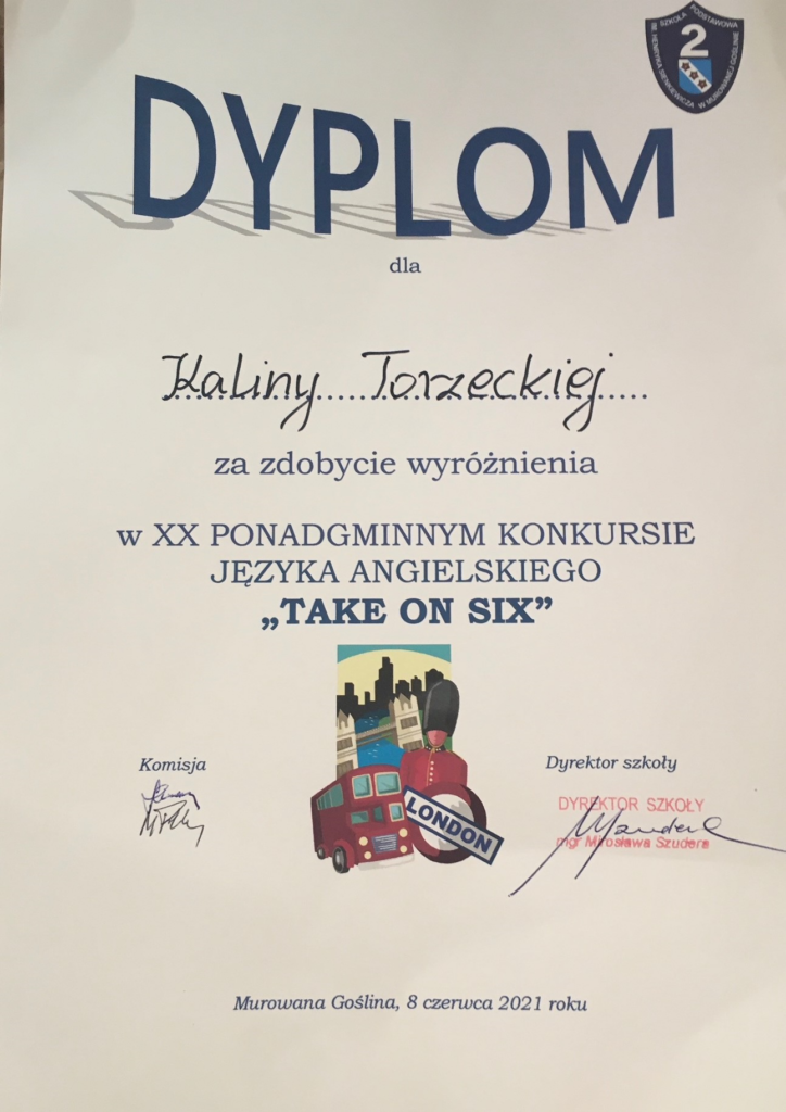 W dniu 8 czerwca 2021 r. sześcioro uczniów klas szóstych naszej szkoły wzięło udział w XX powiatowym konkursie języka angielskiego Take-on-six. Konkurs odbył się w siedzibach szkół, które brały w nim udział: Zespół Szkół w Biskupicach, Szkoła Podstawowa w Kicinie, Szkoła Podstawowa w Koziegłowach, Szkoła Podstawowa w Pniewach, Szkoła Podstawowa nr 1 w Murowanej Goślinie oraz Szkoła Podstawowa nr 2 w Murowanej Goślinie. Każdy z uczestników otrzymał dyplom, a osoby wyróżnione nagrody rzeczowe.